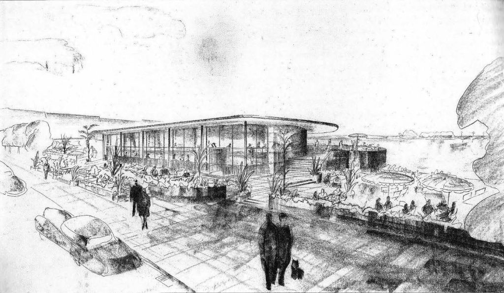 Alsterpavillon Hamburg, perspektivisches Schaubild vom Jungfernstieg, Ferdinand Streb, ca. 1952, @ Bestände Familie Streb