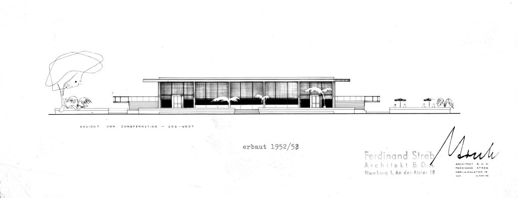Der denkmalgeschützte Pavillon wurde durch verschiedene Betreiber mehrfach umgebaut, zuletzt Anfang der 2000er Jahre, als die Gastrokette ALEX in das Gebäude einzog. Nach der Sanierung soll der Bau wieder die Leichtigkeit der 50er-Jahre-Architektur ausstrahlen und zugleich einen Rahmen für die Gastronomie der neuen Pächter Hannes Schröder (Küchenfreunde) und Niklas Nordmann (Ratsherrn Brauerei) bieten: Dem differenzierten Umbaukonzept folgend, werden prägende Elemente des Originalentwurfs von 1952 wiederhergestellt. Besonders freuen wir uns auf die neue Dachterrasse mit einem spektakulären Blick über die Binnenalster, die Ferdinand Streb detailliert geplant hatte, wie die Recherche im Hamburger Architektur-Archiv ergab. Nun ist angestrebt, sie 70 Jahre später umzusetzen, so dass der Ort und die Architektur auf besondere Weise erlebt werden können.