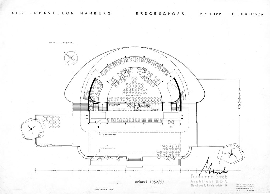 Die Geschichte des Alsterpavillons geht zurück bis ins Jahr 1799: Als wohl erste Eisdiele Deutschlands gestartet, wurde das Ausflugslokal an einem der prominentesten Orte Hamburgs seit mehr als 200 Jahren immer wieder neu errichtet und modernisiert. Der Neubau von Ferdinand Streb nach den Zerstörungen des Zweiten Weltkriegs war der sechste Pavillon an dieser Stelle. Das halbrunde Gebäude schwingt sich mit raumhoch verglaster Fassade zur Binnenalster und scheint über dem dunkler abgesetzten Sockelgeschoss – den Fundamenten des Vorgängergebäudes – zu schweben.